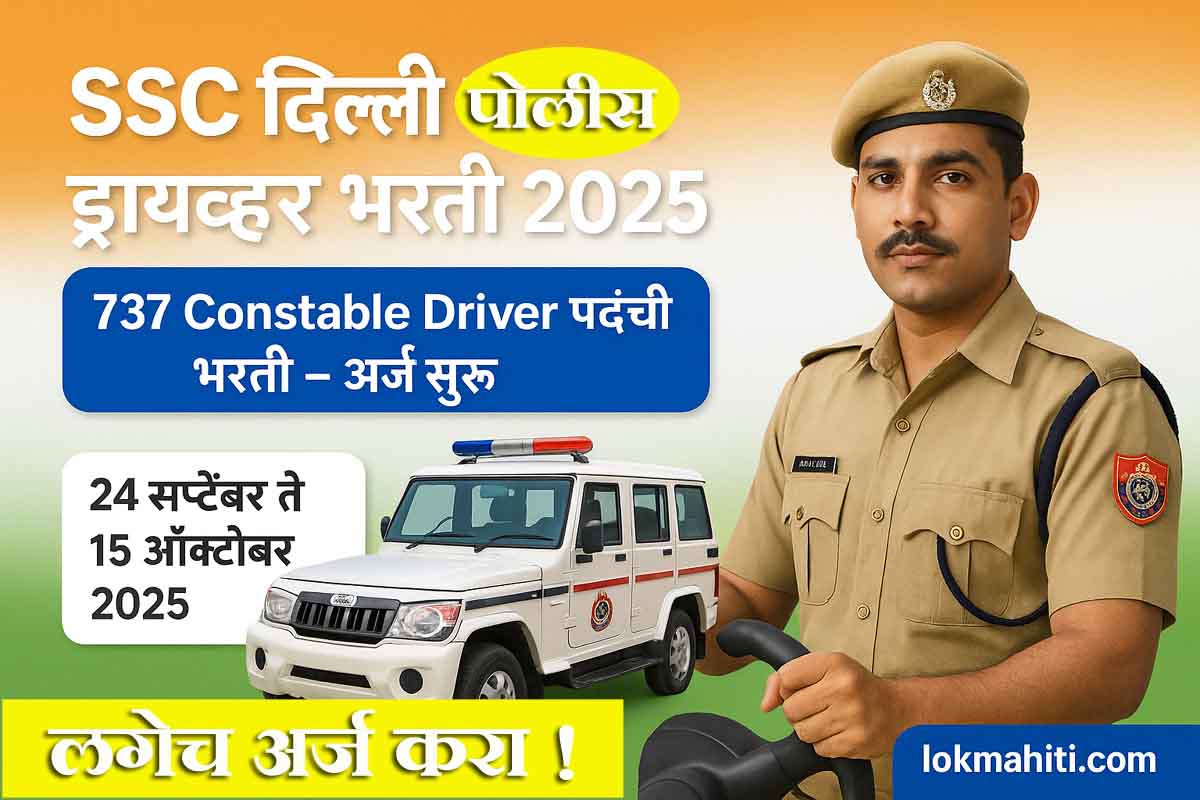 Staff Selection Commission (SSC) आणि Delhi Police यांनी एकत्रितपणे Constable (Driver) Male Recruitment 2025 ची अधिसूचना जारी केली आहे. या भरतीसाठी संपूर्ण भारतातील उमेदवार अर्ज करू शकतात. अर्ज प्रक्रिया 24 सप्टेंबर 2025 ते (SSC Delhi Police Driver Last Date)15 ऑक्टोबर 2025 दरम्यान सुरू राहील .